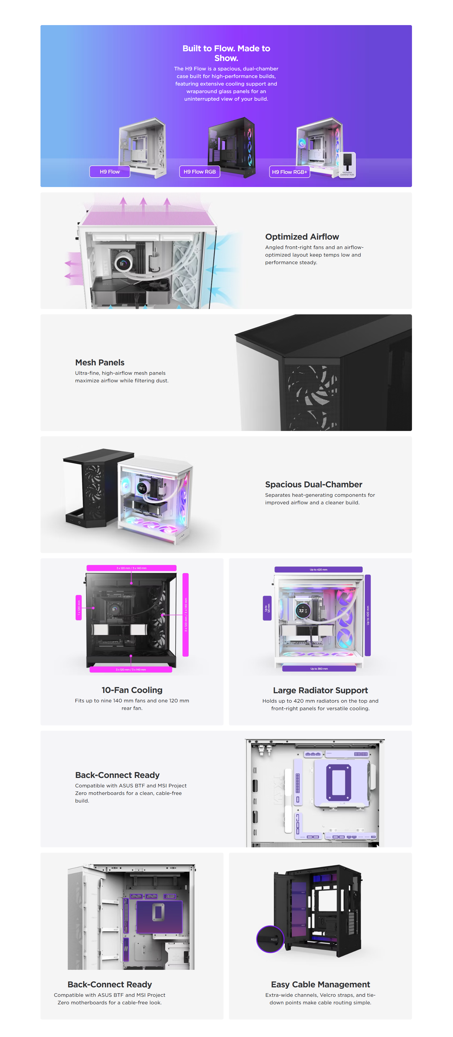 NZXT H9 Flow Dual-Chamber ATX Mid-Tower Case High-Airflow Design with Panoramic Tempered Glass, Supports Dual 360mm Radiators, Up to 10 Fans, E-ATX Compatibility, Black | CM-H92FB-01