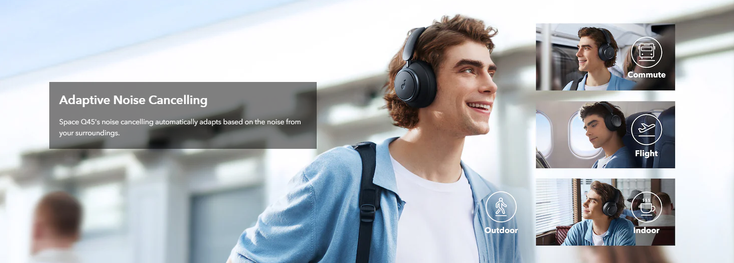 98% Less Noise for Your Journey: The fully-upgraded noise cancelling system targets and blocks out a wider range of noises—from plane engines to crying babies. Enjoy personal space wherever you go with Space Q45 noise cancelling headphones.