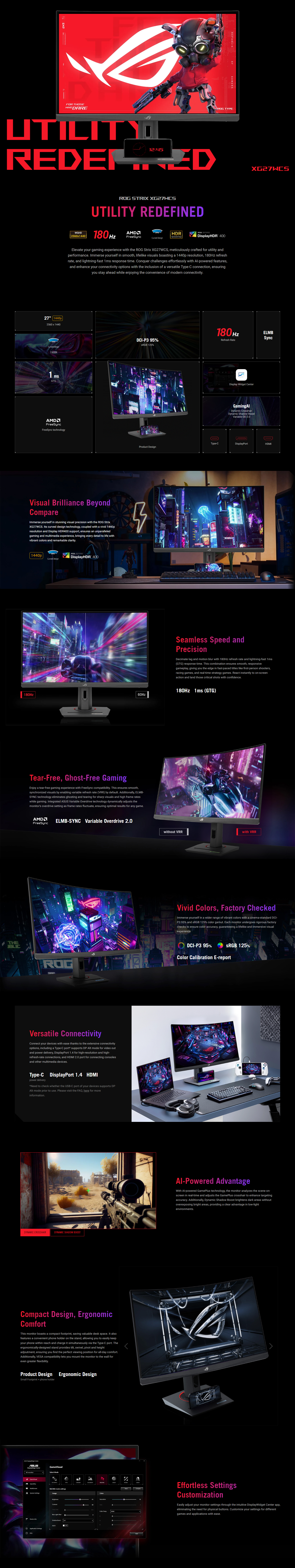 ROG Strix XG27WCS USB Type-C Gaming Monitor – 27-inch 2560x1440, Curved, 180Hz (Above 144Hz), 1ms (GTG), Fast VA, Extreme Low Motion Blur Sync, USB Type-C, FreeSync, DisplayWidget Center, tripod socket, HDR