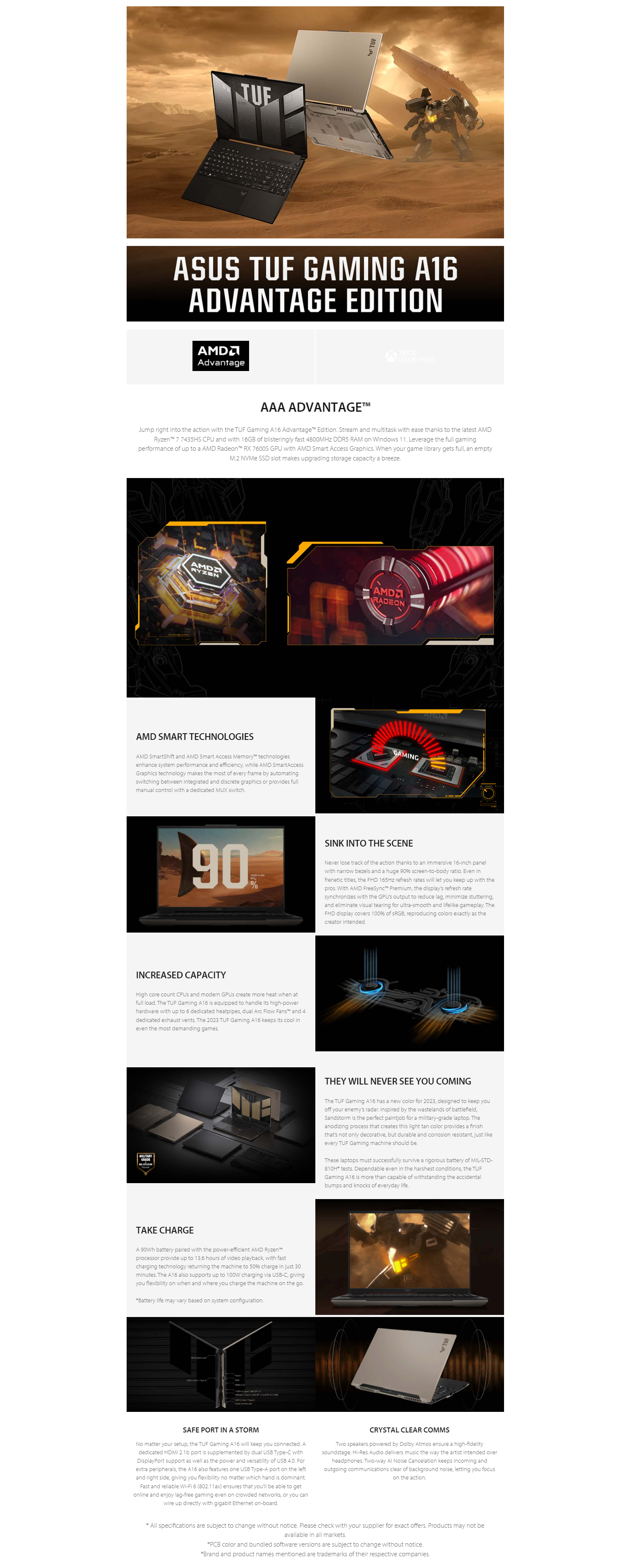 Jump right into the action with the TUF Gaming A16 Advantage™ Edition. Stream and multitask with ease thanks to the latest AMD Ryzen™ 7 7435HS CPU and with 16GB of blisteringly fast 4800MHz DDR5 RAM on Windows 11. Leverage the full gaming performance of up to a AMD Radeon™ RX 7600S GPU with AMD Smart Access Graphics. When your game library gets full, an empty M.2 NVMe SSD slot makes upgrading storage capacity a breeze.
