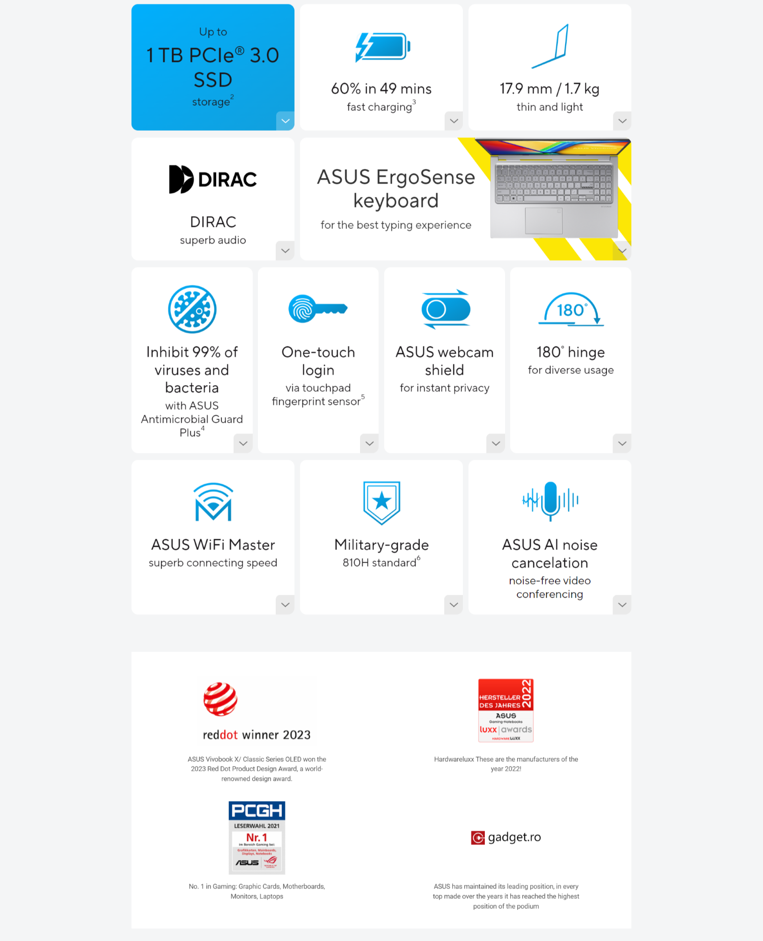 Turn everyday tasks into something special with Vivobook 15, your essential tool for getting things done easier, anywhere. It’s completely user-friendly too, with its 180° lay-flat hinge and physical webcam shield. ASUS Antimicrobial Guard Plus protects frequently touched surfaces from harmful bacteria, safeguarding your health. Make all your days more enjoyable with Vivobook 15!