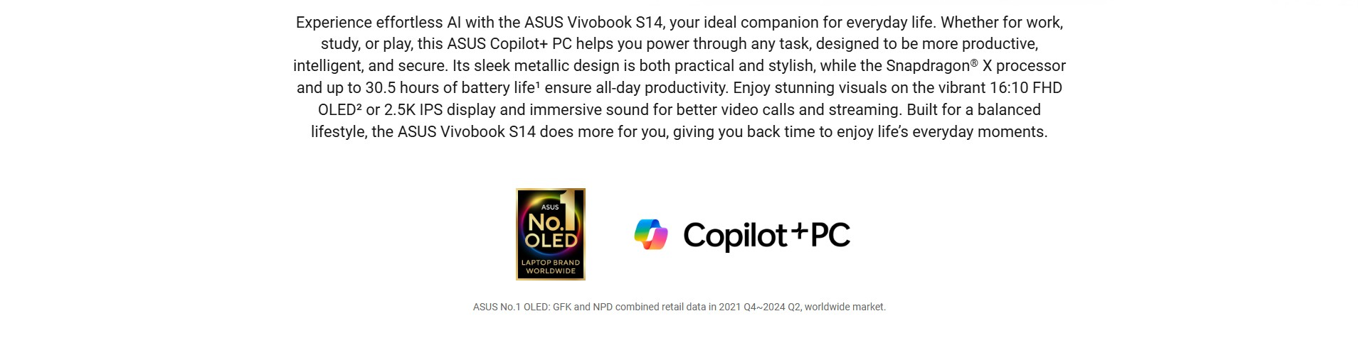 ASUS Vivobook S14 S3407QA Copilot+ Laptop, 14" WQXGA IPS 60Hz Display, Snapdragon X X1 26 100, 16GB RAM, 1TB SSD, Qualcomm Adreno GPU, English-Arabic Keyboard, Win11, Matte Gray | 90NB16B2-M000V0