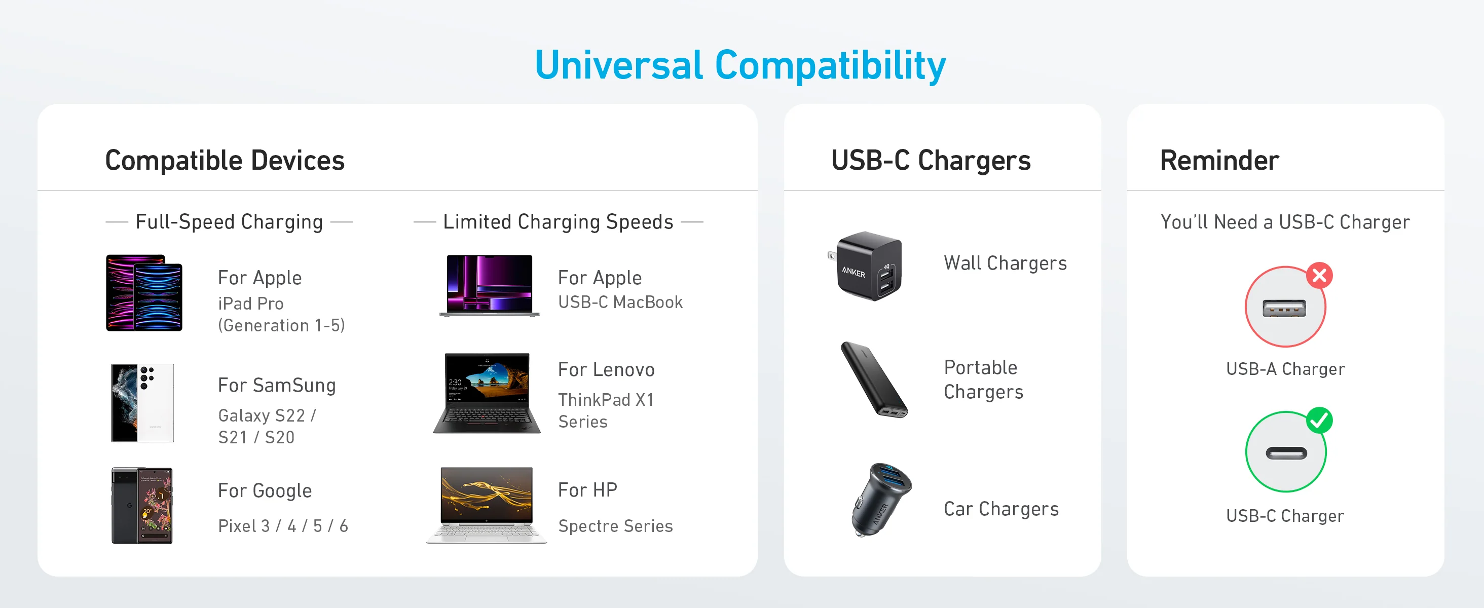 High-Speed Compatible: Charge a Samsung S23 to 55% in just 30 minutes when paired up with a compatible Power Delivery charger (charger not included).