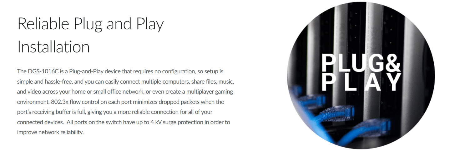 D-Link DGS-1016C 16-Port Gigabit Unmanaged Switch, 32 Gbps Switching Capacity, Silent Operation, 256 KBytes Packet Buffer Size, Plug-and-Play Installation, Black | DGS-1016C