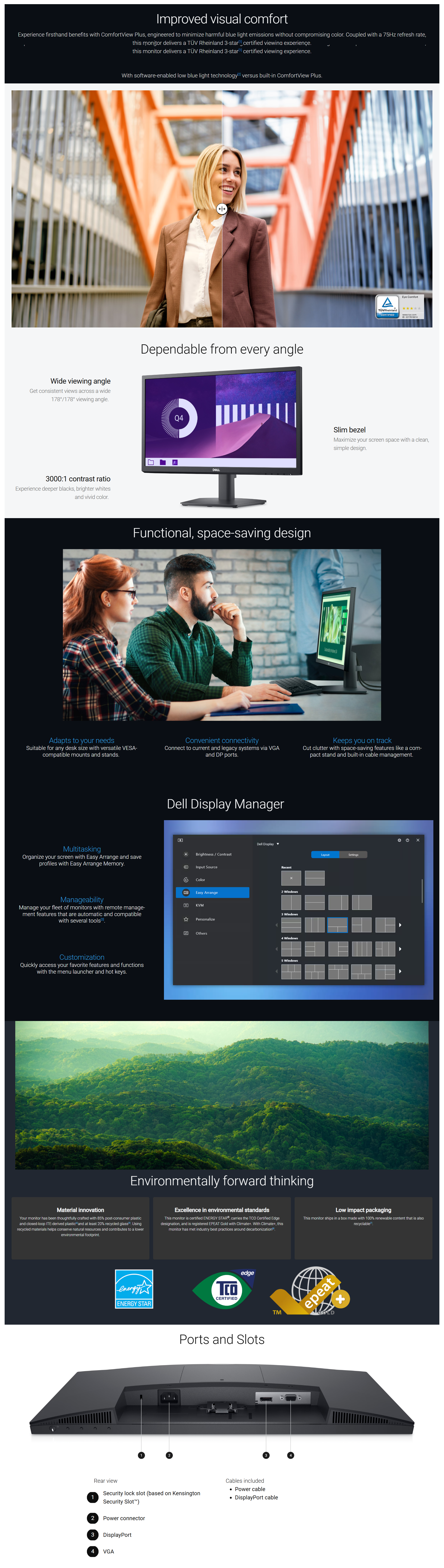 Features | Cable Lock Slot, Narrow Bezel, Anti-glare, Security Lock, Eye Comfort Technology, Mercury-Free, Arsenic-Free Glass |