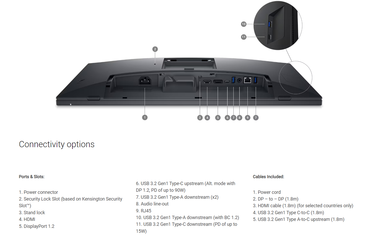 Cables Included | 1 x DisplayPort cable - DisplayPort to DisplayPort - 1.8 m, 1 x HDMI cable - 1.8 m (for selected countries only), 1 x USB 3.2 Gen 1 upstream cable - USB Type A to C - 1.8 m, 1 x USB 3.2 Gen 1 upstream cable - USB-C - 1.8 m |