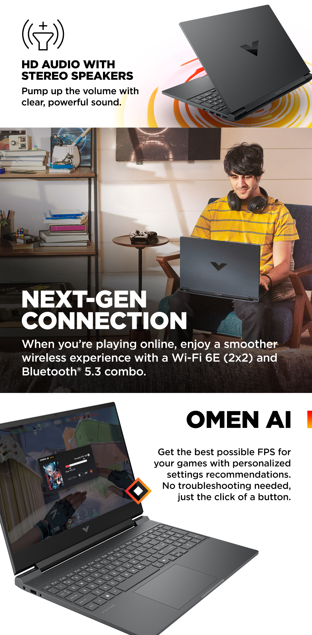 Wireless | Intel® Wi-Fi 6E AX211 (2×2) + Bluetooth® 5.3, Modern Standby, HP Extended Range Wireless LAN |