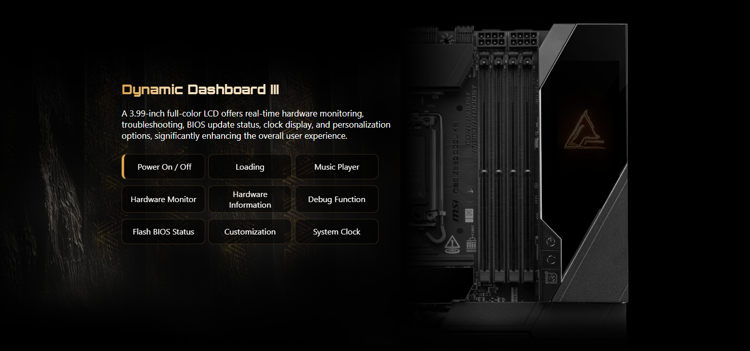 Dynamic Dashboard III: A 3.99-inch LCD for real-time hardware monitoring, troubleshooting, BIOS updates, and personalized display options, enhancing the overall user experience.