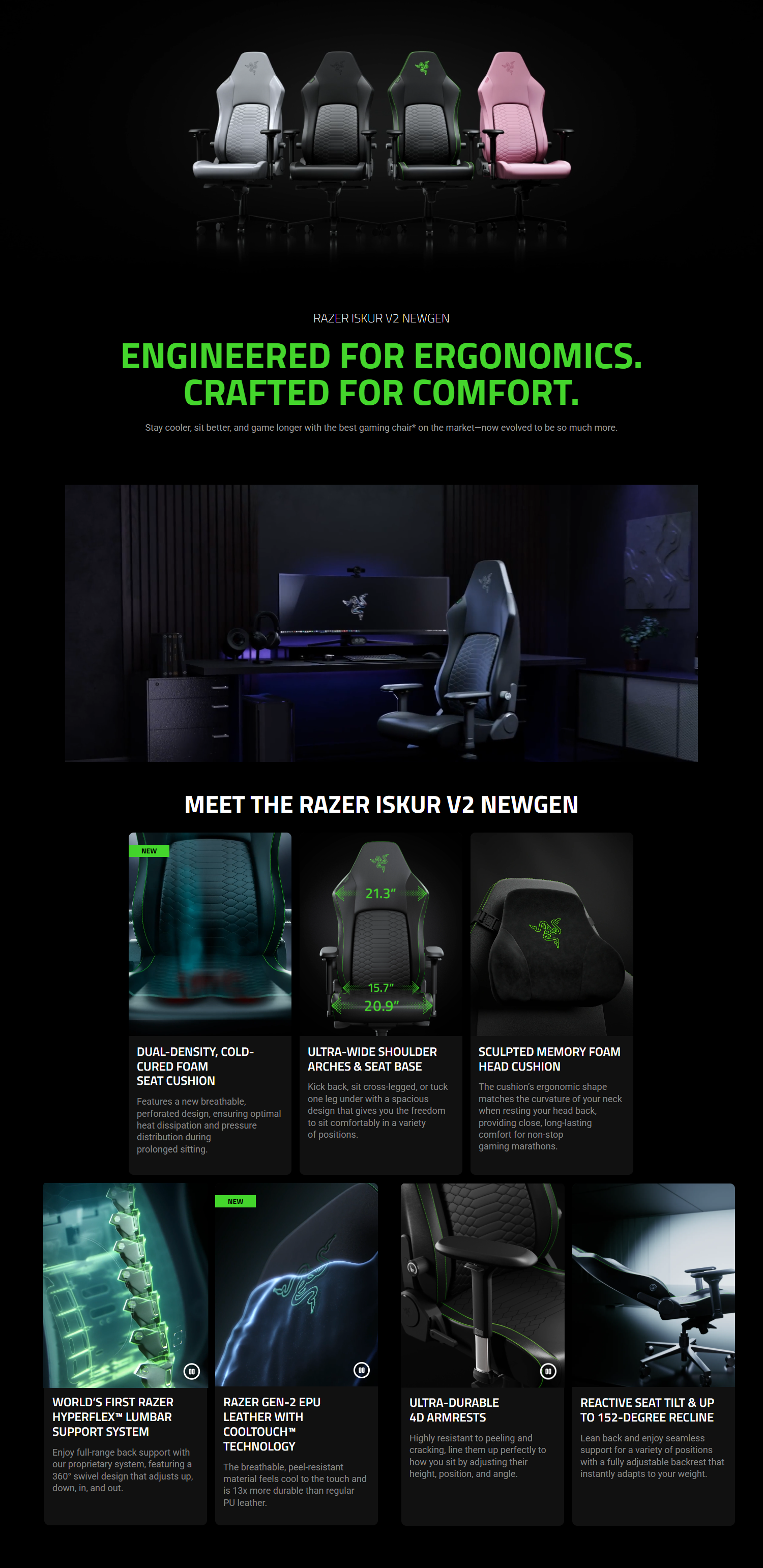 RAZER Iskur V2 NewGen Gaming Chair, HyperFlex™ Lumbar Support System, Gen-2 EPU Leather WITH CoolTouch™ Technology, Cold-Cured Foam, 4D Adjustable Armrests, Black / Green | RZ38-04900700-R3G1