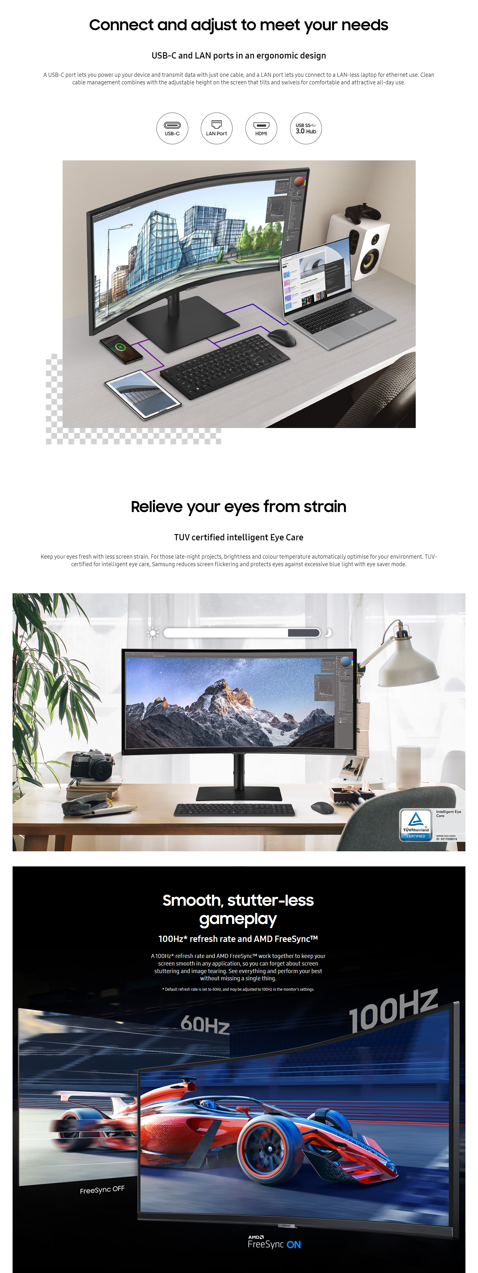 Immerse yourself in games, movies or design projects. A 34" 1000R curved display surrounds you with a 21:9 aspect ratio. The curve aligns with your line of sight, so you can maximise your display and reach new levels of productivity with less eye strain.