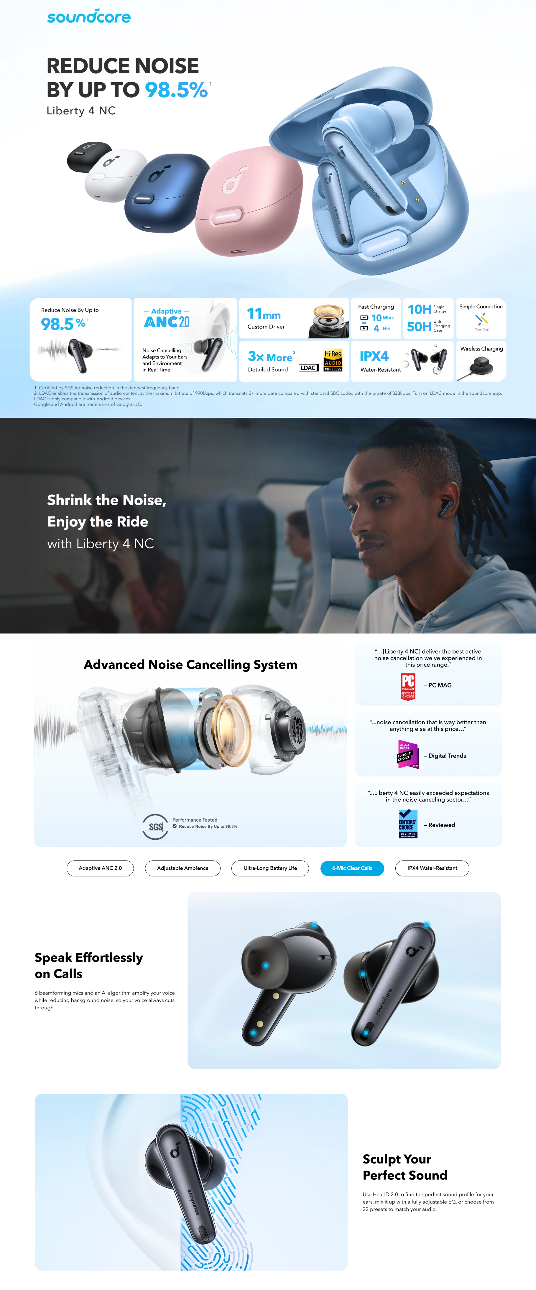 The Liberty 4 NC True-Wireless Noise Cancelling Earbuds deliver exceptional sound quality with advanced noise cancellation technology. Designed for a seamless listening experience, they feature high-resolution audio with LDAC support and customizable sound profiles through the HearID app. Offering up to 10 hours of playtime on a single charge and an additional 30 hours with the charging case, these earbuds ensure all-day listening. With Bluetooth 5.3 connectivity, touch controls, and IPX4 water resistance, the Liberty 4 NC earbuds are perfect for any environment, providing superior sound and convenience.