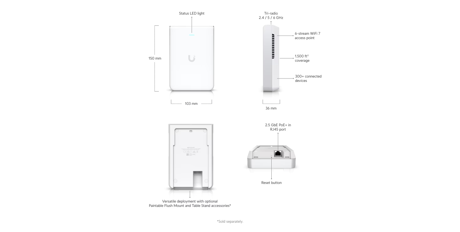 U7-Pro-Wall is a high-performance Wi-Fi 7 wall-mount access point designed for modern offices, hotels, and smart homes. It delivers fast tri-band wireless (2.4/5/6 GHz), higher capacity for many connected devices, and strong in-room coverage with a clean, low-profile design. Ideal for dense environments needing reliable speed, roaming, and easy installation.